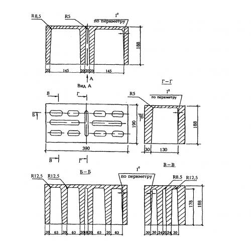 Камни для кладки стен КСР-ПР-ПС 39. Унифицированные изделия, имеющие прямоугольную форму с рядом конструктивных особенностей в виде выступов, углублений и отверстий.